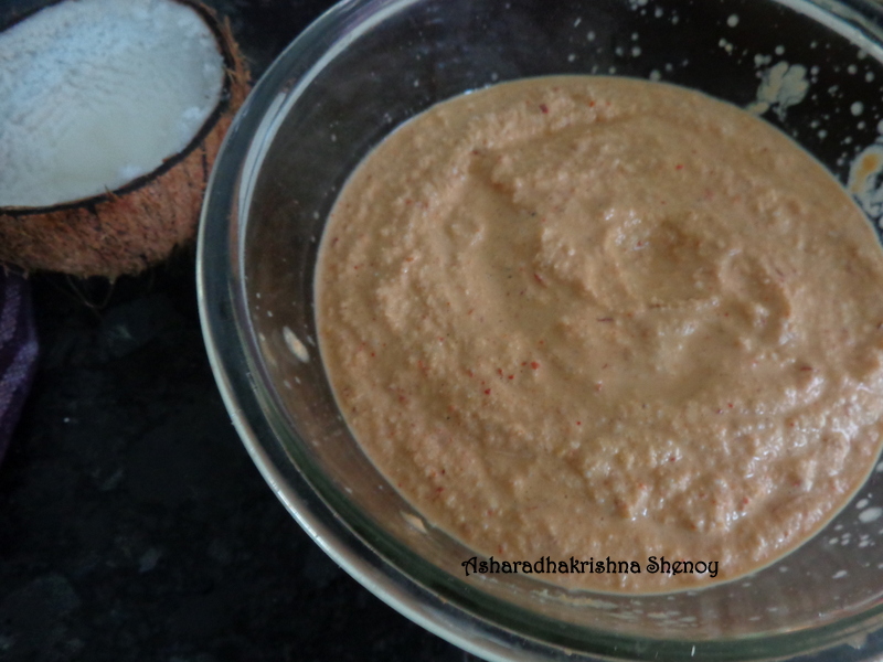 - Grind grated coconut,red chillies,tamarind and hing to a smooth paste.Add salt and the soaked dal and rice.