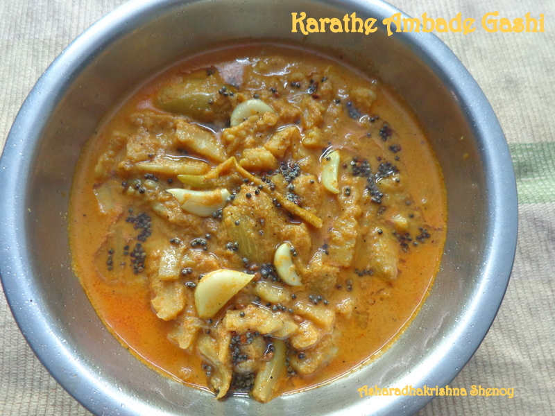 Chop the bittergourd lengthwise 2″ inch long apply salt and keep for 10 minute s . Crush Ambade with a mortar and pestle.