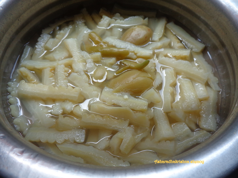 Now squeeze the bitter gourd and ambade and add slit green chilly to it . Cook them together with a cup of water till the bitter gourd turns soft.