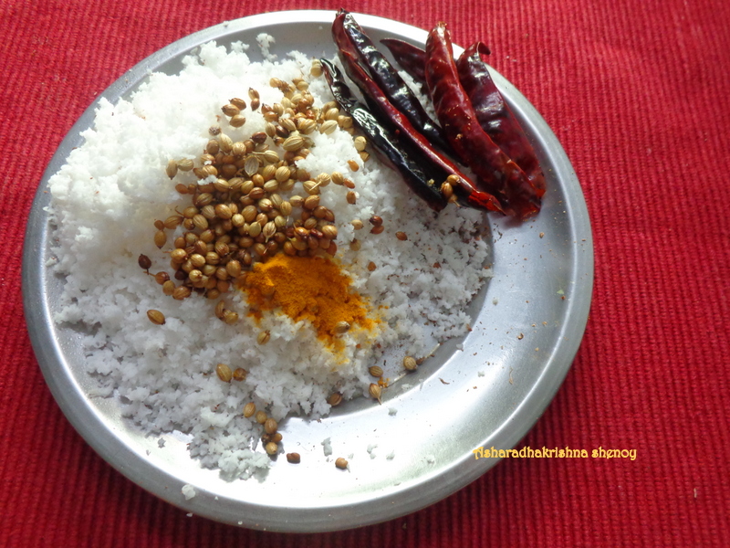 Roast red chillies,coriander and methi each separately in 1/2 tsp oil for a while and grind along with turmeric and the coconut to a fine paste adding little water and keep aside.