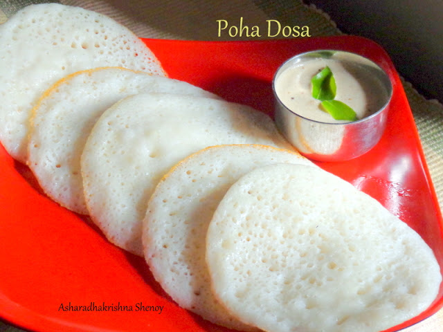 Poha means Riceflakes or flattened rice. Among the numerous dosa varieties , Poha dosa is amazingly soft , with lovely porous on top. It has a beautiful spongy texture and stays soft for some hours even if not hot. The batter should be well fermented.
