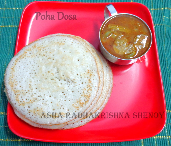 Poha means Riceflakes or flattened rice. Among the numerous dosa varieties , Poha dosa is amazingly soft , with lovely porous on top. It has a beautiful spongy texture and stays soft for some hours even if not hot. The batter should be well fermented.
