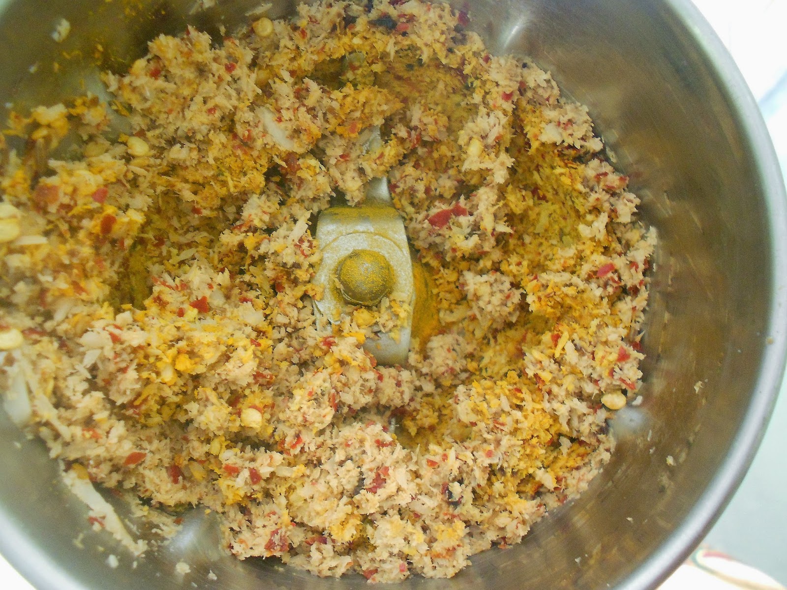 - Grind to a coarse paste – the coconut , red chillies , tamarind & turmeric powder adding very little or no water