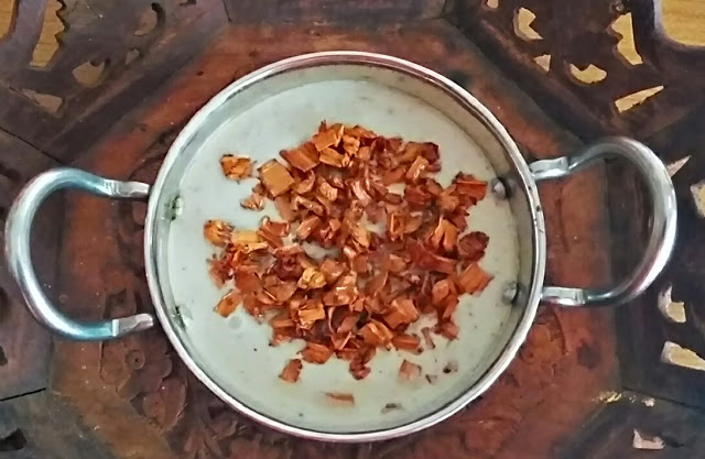 - Grind together the coconut gratings, green chillies, hing to a fine paste.