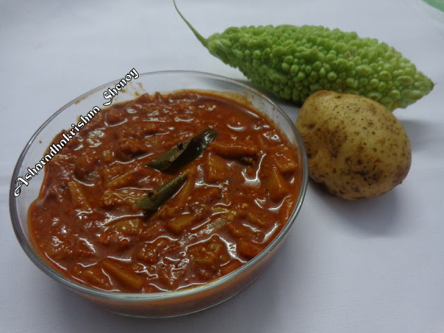 Karathey and batato (bitter gourd and potato) nonche/pickle is a unique combination which I learnt from my mother in law.We prepare this especially on Gowri Pooja/Vayana pooja.This is a instant pickle and stands for 3-4 days by refrigerating or heating it twice a day at morning and night.