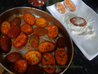 In a fry pan add enough oil.when medium hot place each rice flour coated pieces one by one in the oil and fry on both sides till light brown.