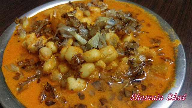 - Cook the chopped magge , chopped onions & peeled alambe in a pan adding a little water , salt & the turmeric powder . see that it does not overcook & become mushy .