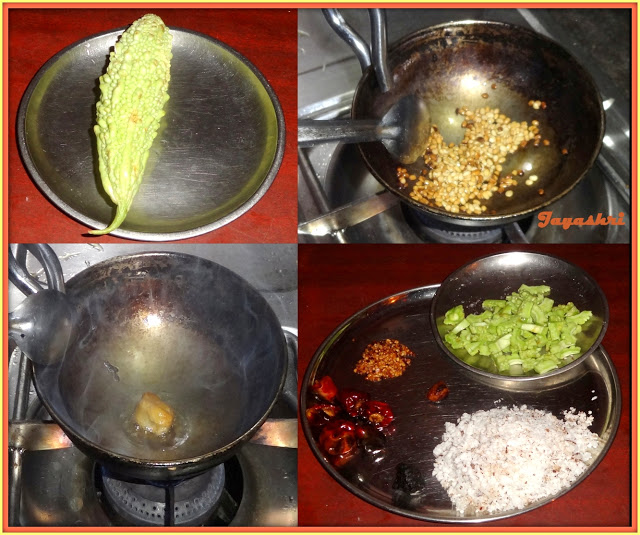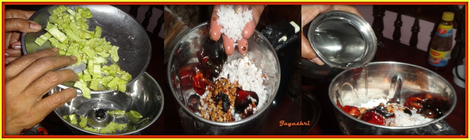 3. After cooling the roasted items, grind the bitter gourd pieces, coconut gratings, roasted red chillies, roasted hing, roasted urad dal, tamarind and salt adding water to a fine paste.