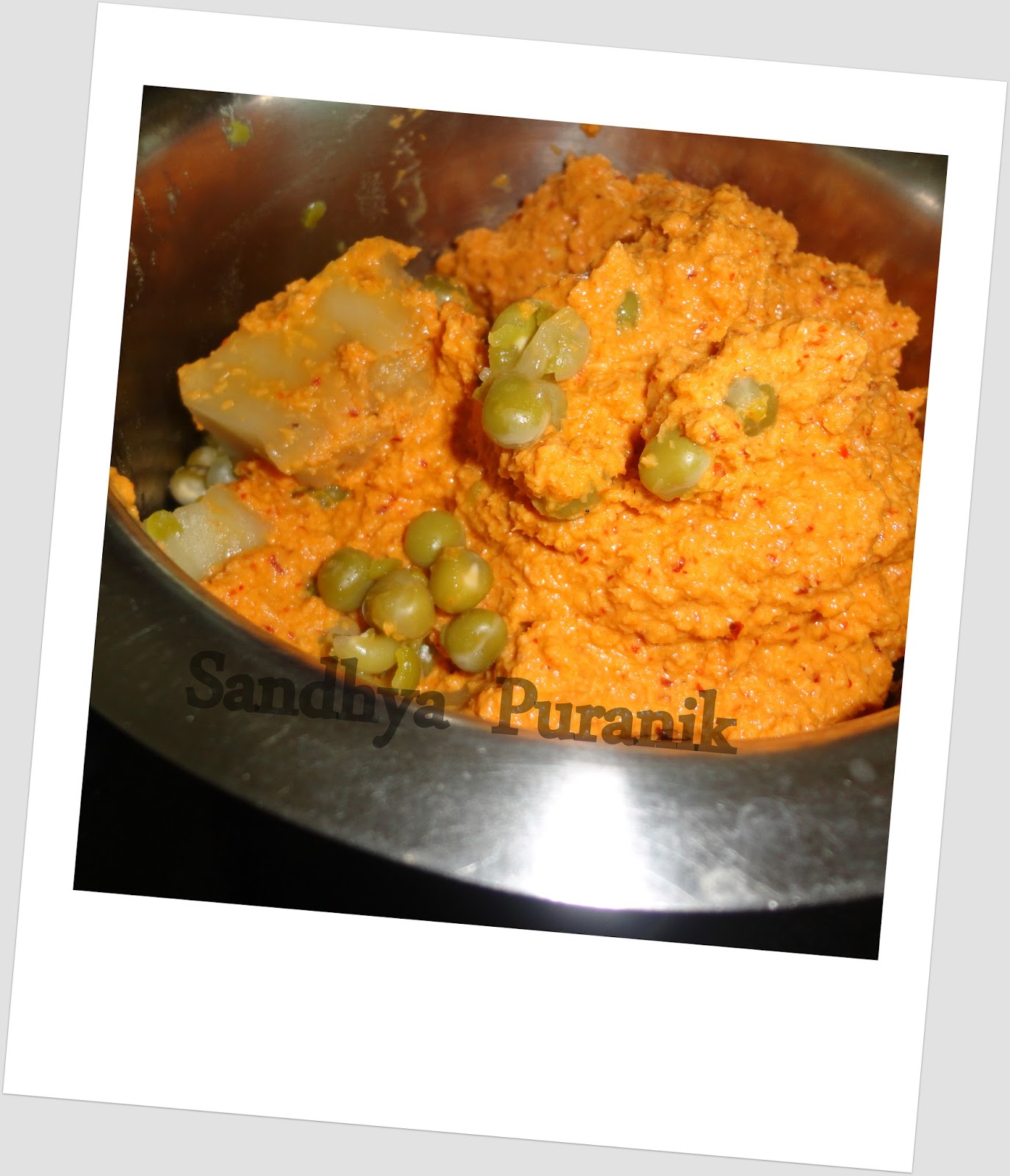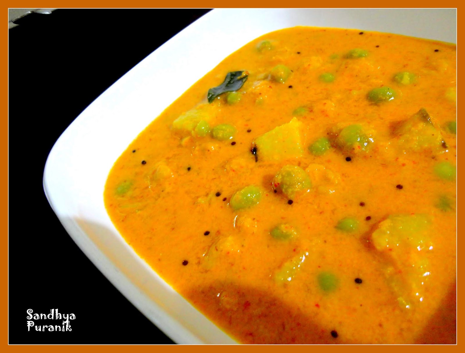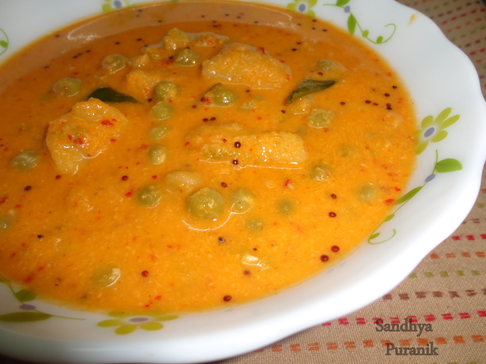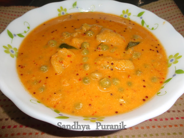 Ghashi’s are the most common and favourite dish in most of the functions in our Community.The most famous is the Chane Ghashi(can use black chana or the white ones) and ofcourse can be enjoyed on other days too.The other ghashi’s are sprouted mung ghashi and batani ghashi- of which am sharing the recipe today.Here green peas are used along with a vegetable the most common being Elephant Yam(surnu) but today am posting the combo of bread fruit(jeev kadgi) and green peas.I had tasted this combo in a wedding and since then I have loved it and it has found a place in my menu.