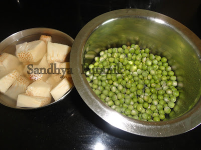 - Pressure cook the green peas for 1-2 whistles or till done. They should be cooked but firm and retain shape