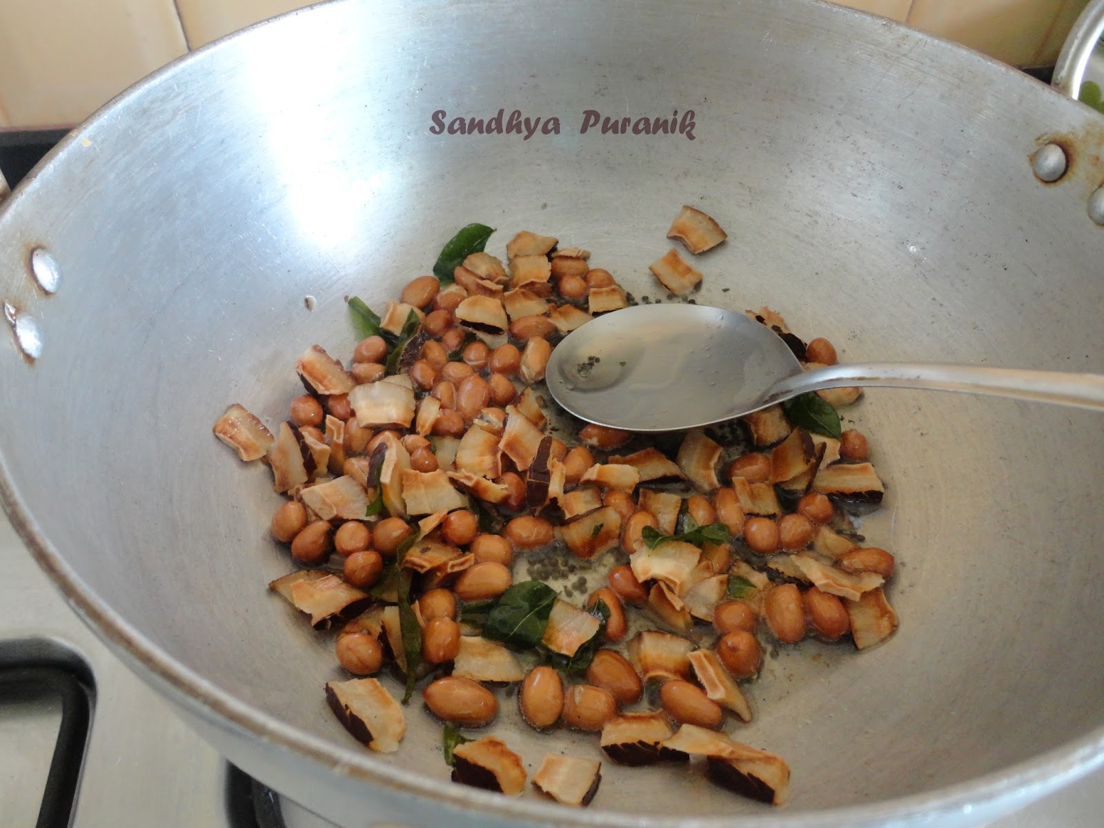 Now add curry leaves, hing and the copra pieces and fry till golden.