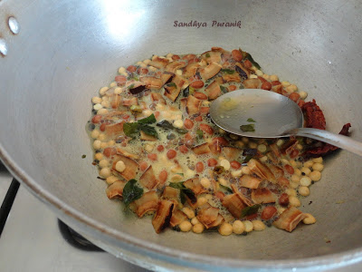 Add turmeric powder,red chillies and the green chilli,pinch salt,sugar and switch off the gas.