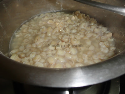 - Combine the cooked pulse and coloured cucumber in a wide vessel along with the cooking liquid, add the ground paste ,salt and water as required and gently boil for 8-10 minutes with stirring in between.