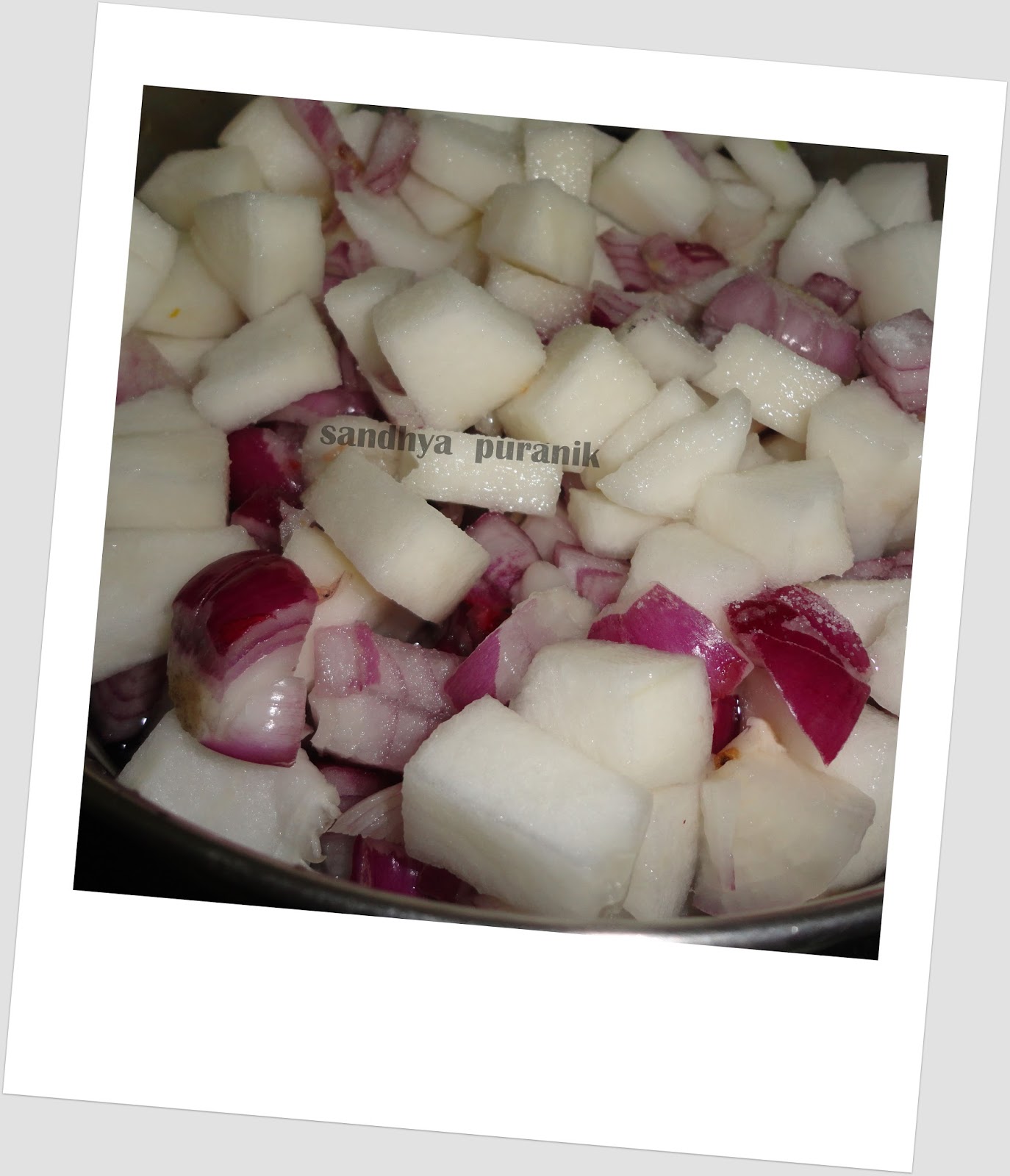 - Pressure cook magge/coloured cucumber along with 1 onion chopped into big chunks.