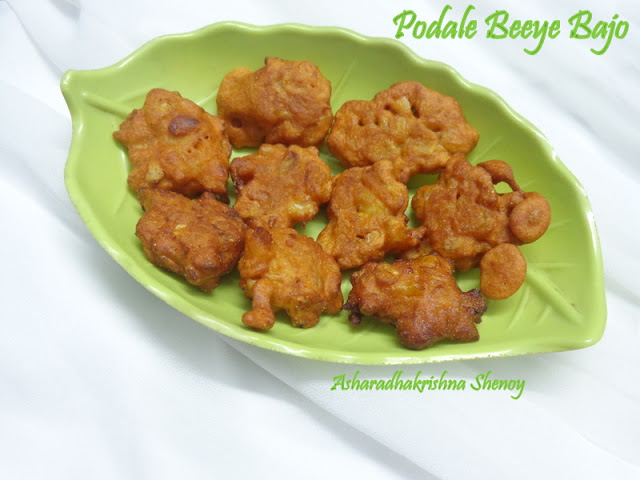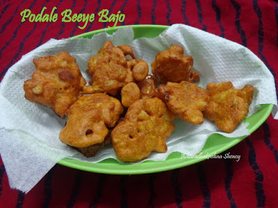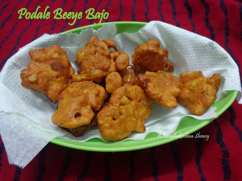 Podale means snakegourd,Bee-(ye) means seed and Bajo means Fritters.Any type of fries are hot favourites of Konkanis.There are endless varieties of bajo’s,phodi’s and Ambado’s in Amchi Konkani cuisine.