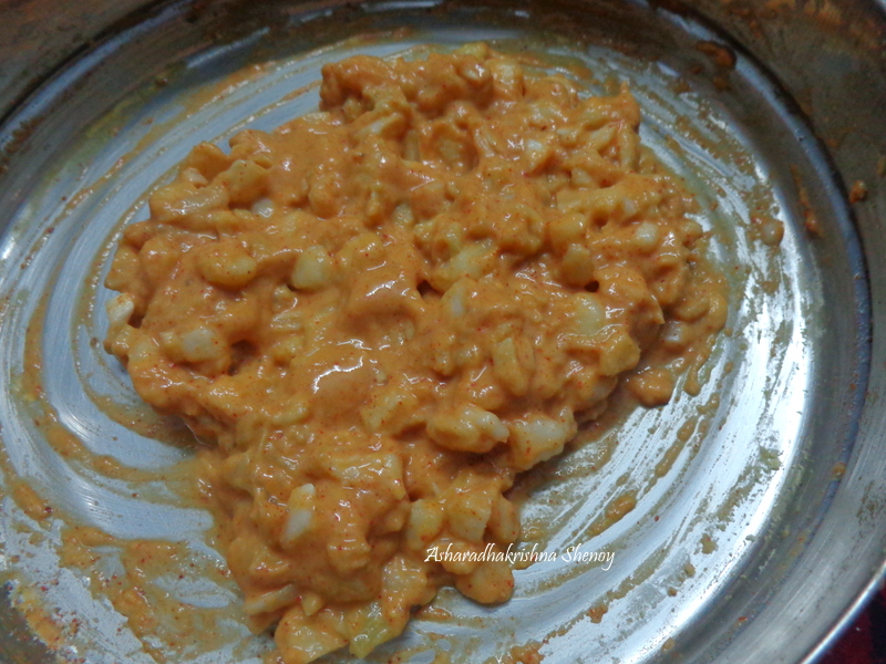 Mix this very well till the powders coats well to the seeds.Do not add water.As the seeds are tender they have moisture and moreover the salt added tends to leave water.