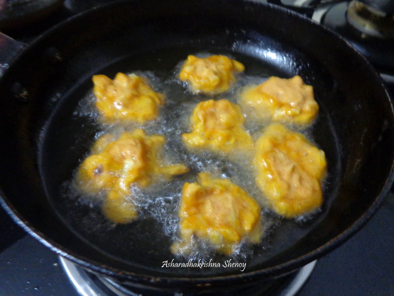 Heat oil in a Kadai.Drop small quantity of the mixed batter in the hot oil and fry them on both sides till golden colour or the besan is cooked .