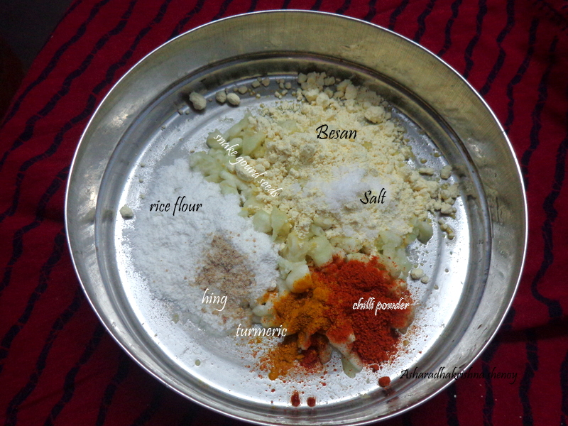 Today I would like to share a variety of bajo which is made with snake gourd seeds,which we usually discard while preparing sabji.This is a fried dish prepared with few ingredients which are always readily available in our kitchen.Once you try this recipe you will never throw away the seeds.Moreover no one can guess that this tasty fritter is made with the gourd seeds.So you can surprise your family members and guests.This can be had as a side dish with rice and any curry of ur choice.