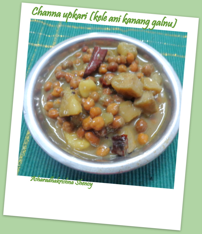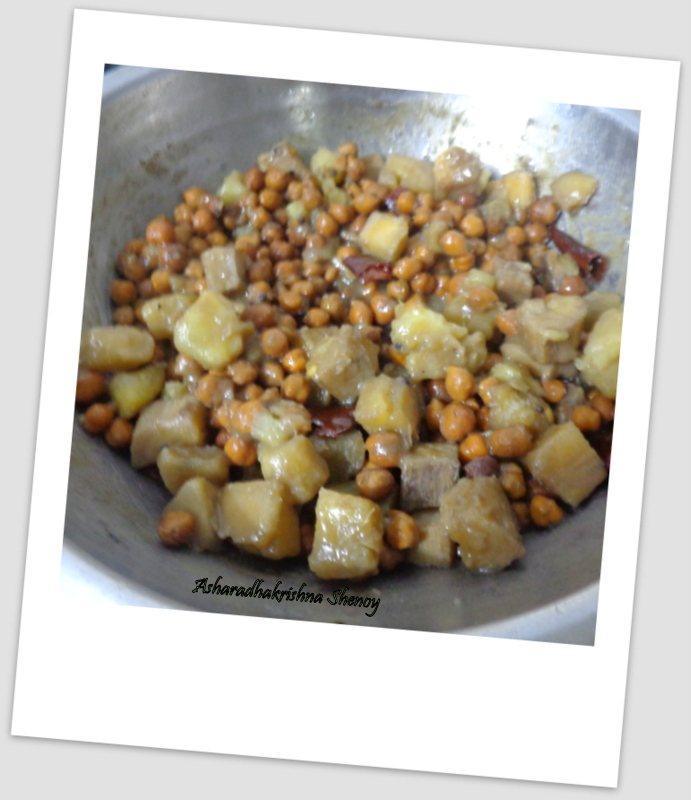 Kele means raw curry banana and Kanang means sweetpotato .This is a simple stir fry recipe, made with previously soaked channa cooked along with banana and sweet potato.This is a good old recipe normally had for breakfast along with spicy poha chutney.A pinch of jaggery adds taste to the curry.Normally on fridays or on festive days this sitr fry is made.If sweet potato is not available you can make just with the combination of chana and raw banana or channa alone.In that case jaggery is excluded.Here is the recipe