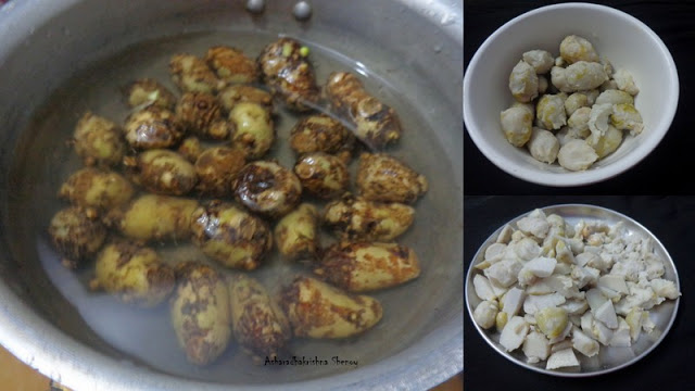 - Now add this chopped mande in a pan.Add a cup of water and salt to it.Boil well,so that the water becomes thick coconut milk like gravy.