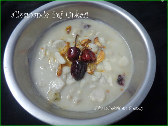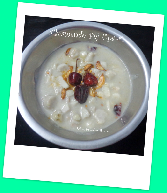 Alva mande means colocasia, is a seasonal root vegetable, Upkari means stir fry.Pej means normally it is referred to rice porridge. You may wonder to note the name of this recipe.But it is called so because this particular dish retains little thick gravy which looks like rice starch.This is an old recipe which is very simple and lip smacking with just 3 main ingredients.This is served with rice as a side dish.The garlic and chillies seasoning gives the wonderful flavor to curry.Those who are allergic to this veggie can try with potato too.