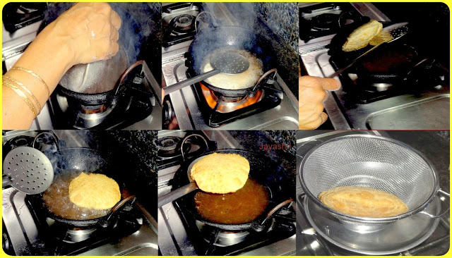 Heat oil for deep frying. When the oil is hot, gently slide one rotti in it. Now gently press using laddle to puff up. Flip and gently press again so to get maximum puff up.  Fry till rotti becomes brown. Continue till all the rottis are fried one by one.