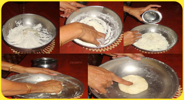 In a pan mix maida very well with salt and hot oil.  Knead the dough adding little water like poori dough and keep aside.