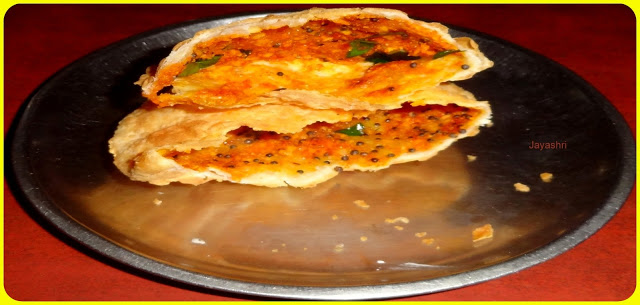 Make seven equal balls of the dough . Divide the filling mixture in to seven  equal parts. Roll the ball  to 3½ inch diameter size poori. Place one part of the filling mixture in the center of the poori. Gather the circular edges and close the fillings completely.  Now roll this filled ball again to 3½ inch diameter size poori.