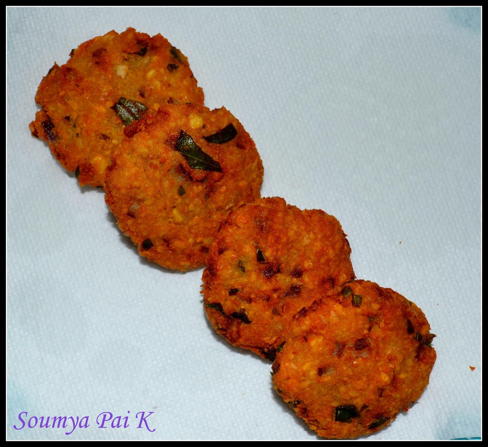 - Heat oil in a kadai on medium flame. Drop these discs into hot oil and fry on a medium flame till they turn golden brown and crispy.