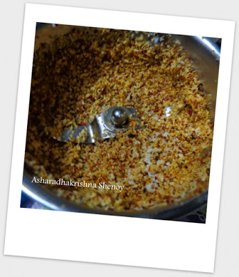 - When cool transfer this to a mixie jar and powder it coarsely along with a marble size tamarind. Remember do not use water to grind the masala.The masala should be ground dry.