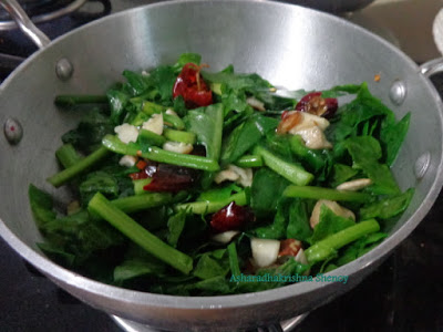 - Wait for a minute and then add the chopped jack seeds,vaali and the chopped tender stem.Add salt and 1/2 cup water for the seeds to cook.Close lid and cook for 5-10 minutes.By this time the vaali also releases water which is enough for the vegetables to cook.