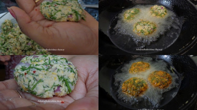 Make small lemon size balls and flatten keeping it between palms.Heat kadai with oil on medium flame.Place 2-3 shaped vadas and fry them on both sides till they turn into light brown in colour.