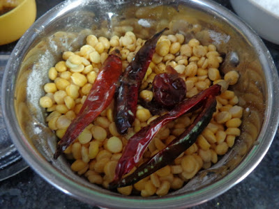 Remove the rice powder in a bowl and keep aside.To the same bowl add the channa dal,red chillies and tamarind.Grind it coarsely without adding water.