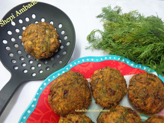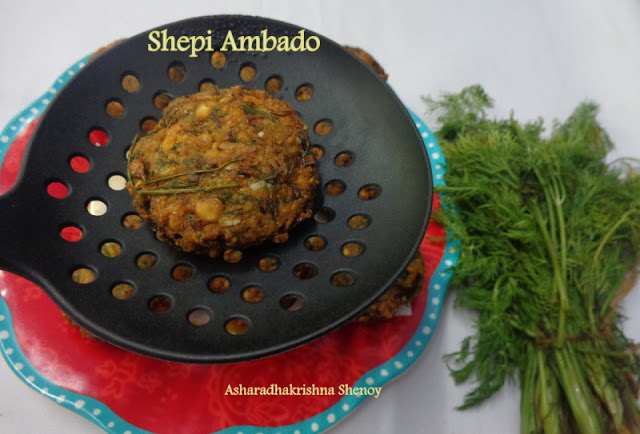 Shepi Bhaji means Dill leaves and Ambado means vada.Any type of fries is favourite of GSB Konkanis.This is famous among Mangalore and Bangaloreans.This leaf has a strong aroma and few don’t like this.This greens is very good for Lactating mothers.