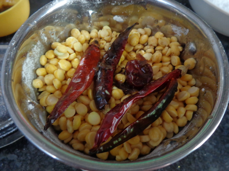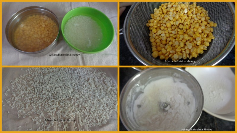 Soak channa dal for 3-4 hrs and Rice for 1/2 hr separately.Spread the rice on a clean cloth and channa dal in a colander to drain the water.Grind the rice to a fine powder form.