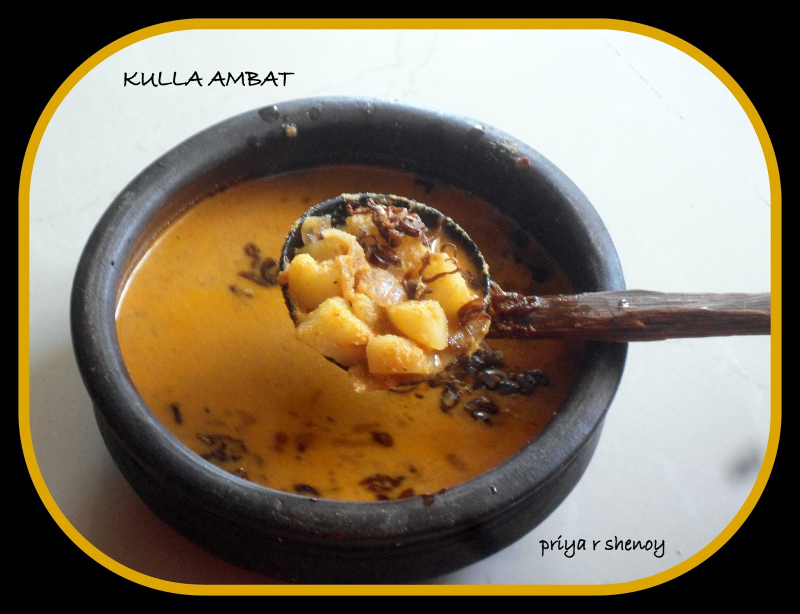 Kulle Ambat !! Sounds amusing ,right ?? Yes,its a traditional recipe of my great grand mom . Its simply the mixed veg ambat (with onion seasoning) but prepared in kulles or clay pans ( the flat ones )…Most of the GSB’s in North Kerala especially in Kannur / Thallashery area are great fish lovers…If on some days for any reasons fish were not available and the dil maange more for fish curries , then she used to prepare this ambat in the kulles. It tasted awesome with the aroma that the claypans would impart generously…