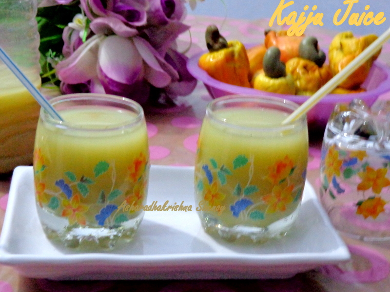 Kajju juice is prepared with the fruit of the cashew nut which is also called cashew apple.This juice was first introduced to me by my Amma . She used to tell me about their cashew farm at her native and how they use to collect the fruit and separate the nuts during the season. She also told me about the taste and how energetic it would be after drinking this juice.Those days people used to pluck the fruit in season,remove the nut by simply twisting it off.The taste of the juice is astringent and leaves a dry feeling in the mouth.First time when I tasted it , I did not like it.But when it was diluted and served chilled I loved it.So its is always better to mix 2 part kajju juice with 1 part water.