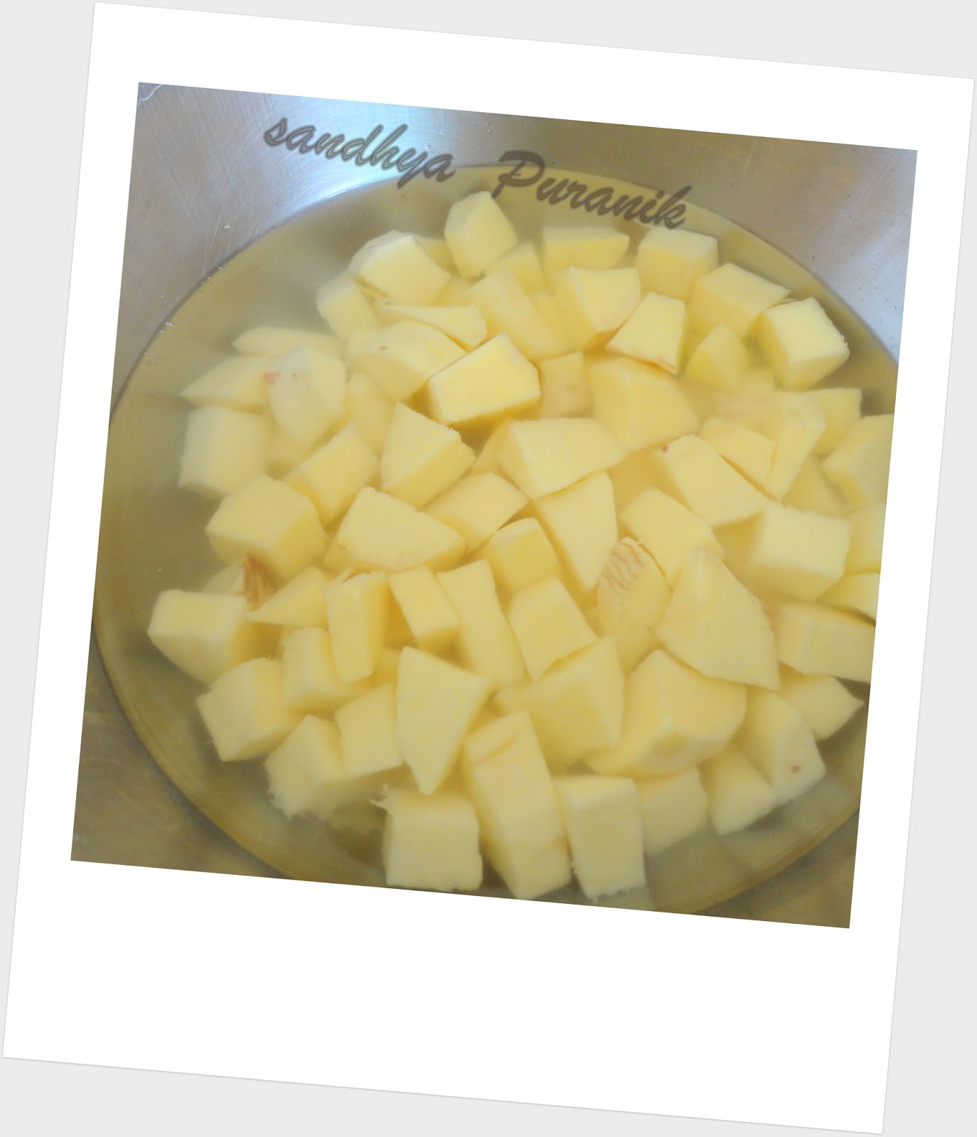 - Wash the sweet potatoes thoroughly to remove all the mud,peel and chop them into small cubes and immerse them in water to avoid them into turning black.
