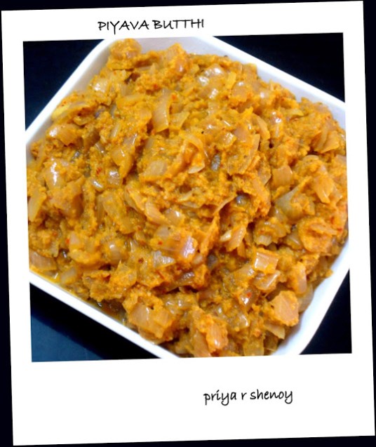 Piyava butthi is a tasty side dish usually had with rice and dalitoy. ” Bhutthi ” is coriander based coconut masala with any vegetable. Here its prepared with onion.