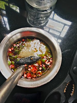- Make a tempering of oil, mustard, when they splutter add hing and curry leaves.