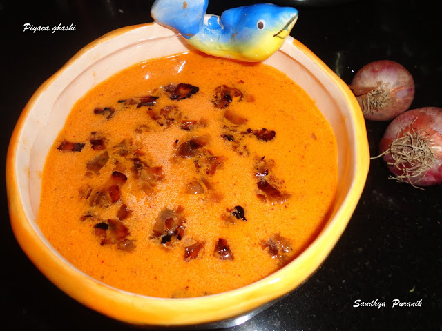 Ghashi is usually done with pulses and vegetable combo,the most commonly used veggie being surnu(elephant yam).It is always seasoned with mustard and curry leaves.This recipe is an exception as it uses only onions and hence the name Piyava Ghashi …piyav is onions in Konkani in south Canara.A very simple recipe where the onions are simmered in a coconut gravy but the taste is something you need to experience yourself.Good for those lazy days when you don’t feel to do much of elaborate cooking, yet want to have something tasty.