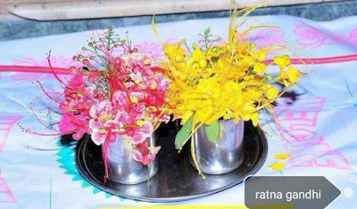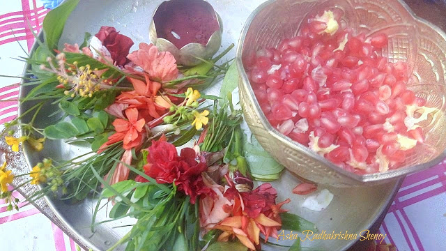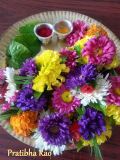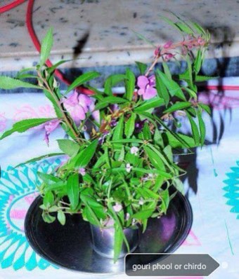 Now with ladies staying far away from family ..it may not be possible to get all the flowers and leaves used traditionally ,so they may perform this with whatever flowers are available locally.