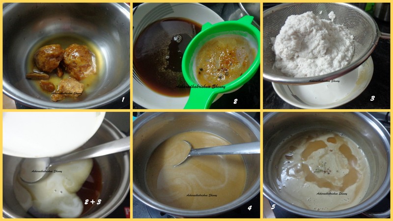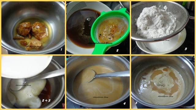 1. In a thick bottom pan add jaggery and water and boil till the jaggery melts. Strain this through a strainer to remove the dirt in the jaggery.