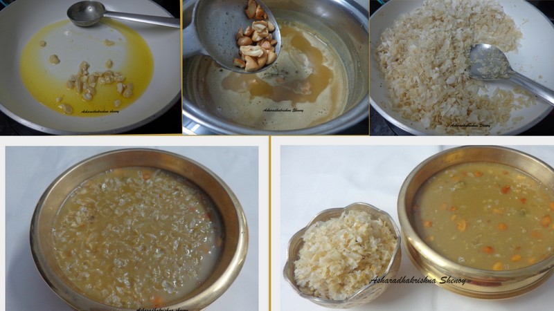 6. Heat ghee in a open pan and fry cashew bits till golden brown. Keep aside.