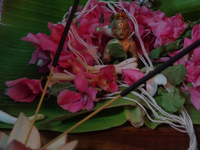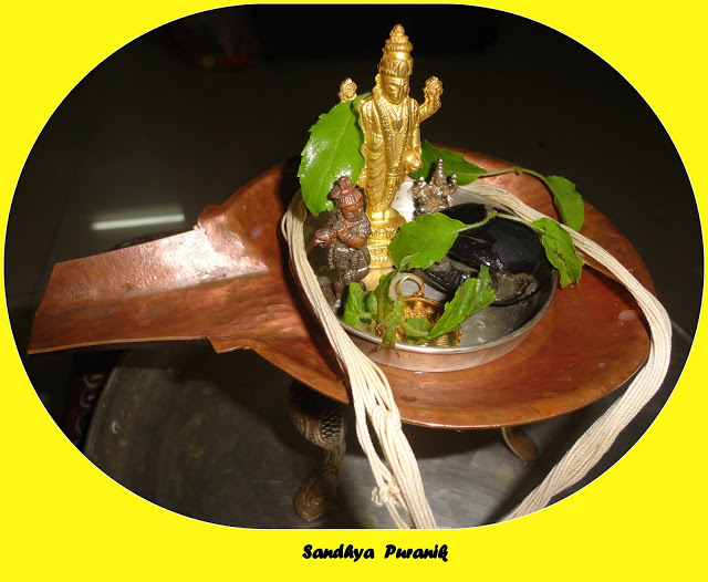 The Idols are arranged in Somasutra along with Saligrama …and .abhisek is offered with milk and water then dala ghalche ( Offering of tulsi leaves ). If you have the custom,or else just abhisheka and pooja will do) .If the family has a tradition of dalo ghalche(offering tulsi leaves) it is usually done at elder’s house(eldest member of the family..(mhalgado) and all the youngsters and their families gather there .
