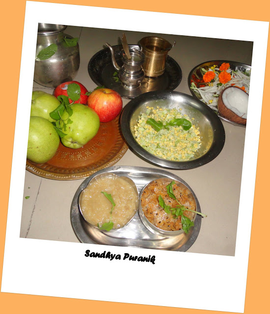 Sri Krisharpanmastu! Naivedya offered along with phalvastu and narlu… here it is phova panchkadayi, poha kheeri and mugadali pachadi
