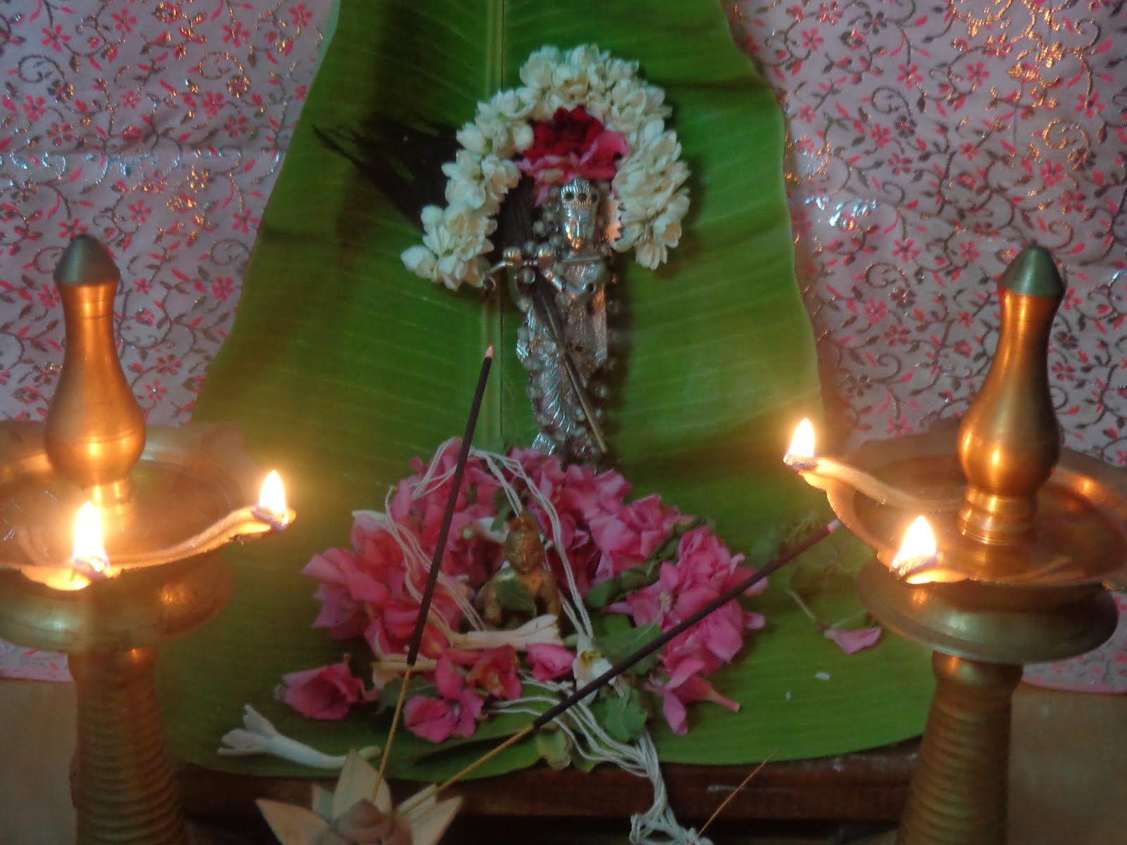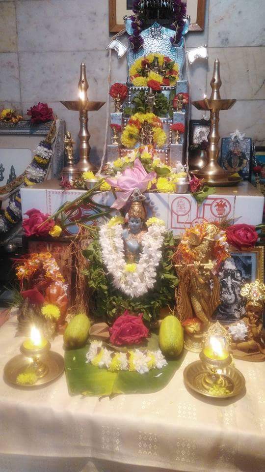 The Idols are arranged in Somasutra along with Saligrama …and .abhisek is offered with milk and water then dala ghalche ( Offering of tulsi leaves ). If you have the custom,or else just abhisheka and pooja will do) .If the family has a tradition of dalo ghalche(offering tulsi leaves) it is usually done at elder’s house(eldest member of the family..(mhalgado) and all the youngsters and their families gather there .