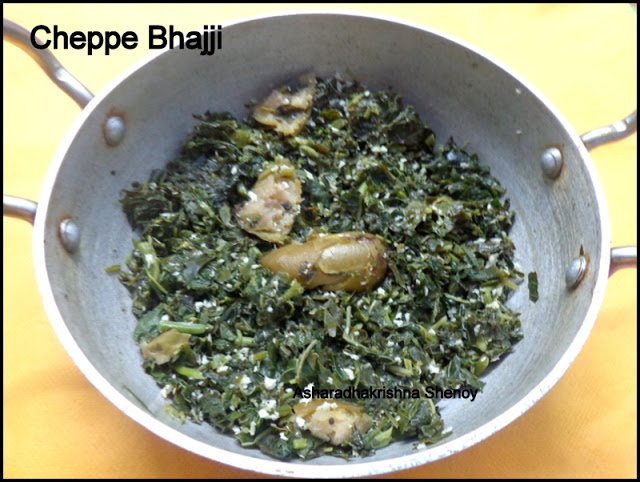 Cheppe Bhajji upkari is a dry stir fry with 5 mixed green leafy vegetable and coconut which is cooked without salt.This upkari is a must and specially done only on Vayana/Gouri pooja . According to folk lore Gouri had forgotten to add salt,so the same is carried through by all the families who perform Vayana pooja.