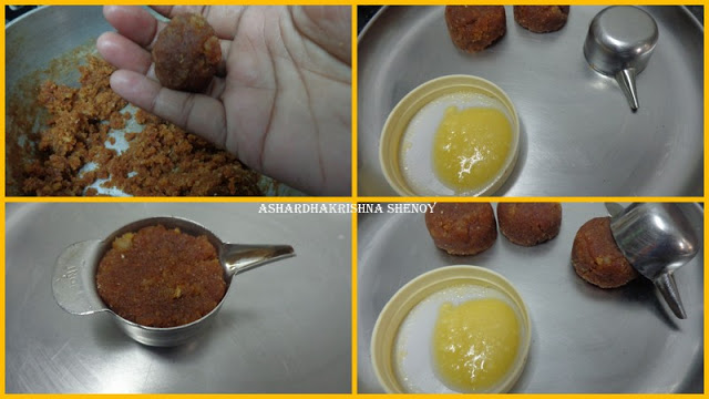 - Heat the kadai again add jaggery and little water when the jaggery melts strain it to remove the mud and dirt . Add it again to the kadai when it starts to boil add the grated coconut and cook for 5 minutes until you see the bubbles. Now slowly add the powdered rice and mix well until the powder and jaggery mix well and form like a dough. Add cardamom powder n mix well.