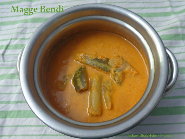 Magge Bendi is a coconut based curry with the flavour of hing and coconut oil in the seasoning. Normally bendi is a curry seasoned with garlic,as we GSB community people prepare Satvik dishes (no garlic and no onion)  during auspicious occasions,garlic seasoning is avoided.These type of recipes can be tasted and temple samradhana.You can find more similar recipes with various combination of vegetables from this blog in the .konkani currys section.